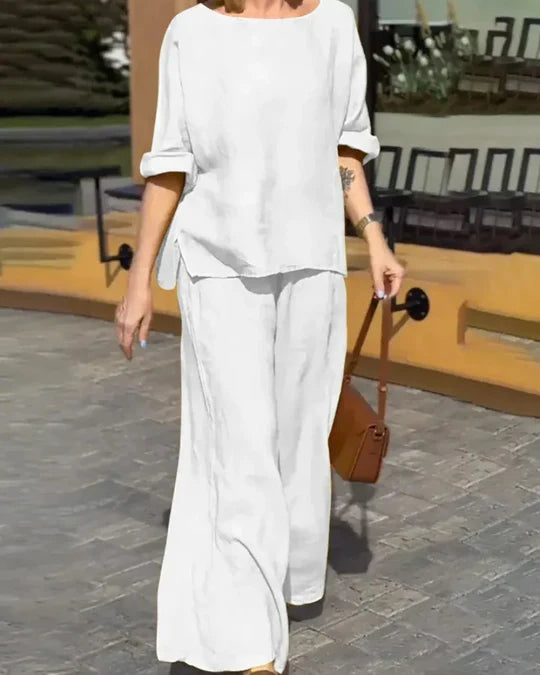 The SHOW™ Linen Two Piece Set combines relaxed elegance with all day comfort. Featuring a loose fit short sleeve top with a classic boat neckline and subtle side slits, paired with flowing wide leg trousers, this coordinated set is crafted from a breathable linen blend. Perfect for casual outings, beach vacations, or laid back polished style, SHOW™ delivers effortless sophistication in warm weather.