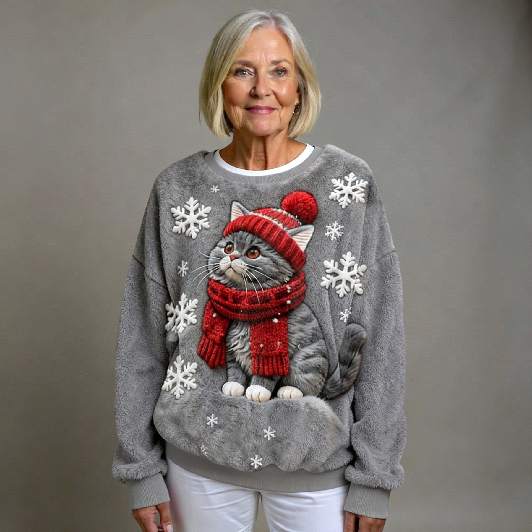 Casual Hooded Flannel Sweatshirt with Christmas Cat Print for Women