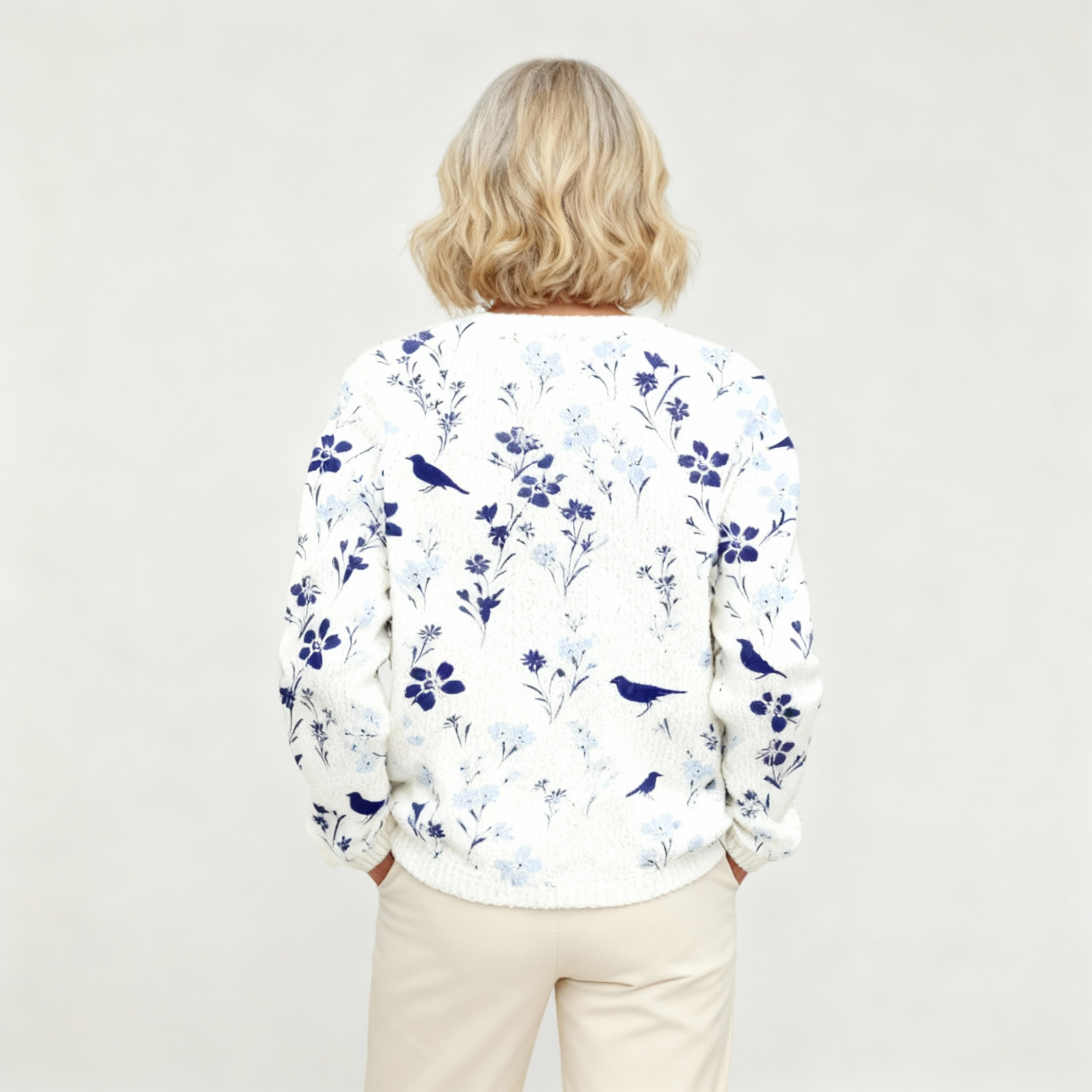 The Fiona™ Cardigan brings together delicate floral artwork and soft, cozy comfort. Its creamy knit base is decorated with vintage-inspired blue flowers and graceful little birds, creating a peaceful, romantic look that feels perfect for women who love subtle, refined beauty.
